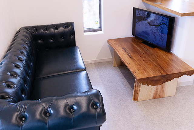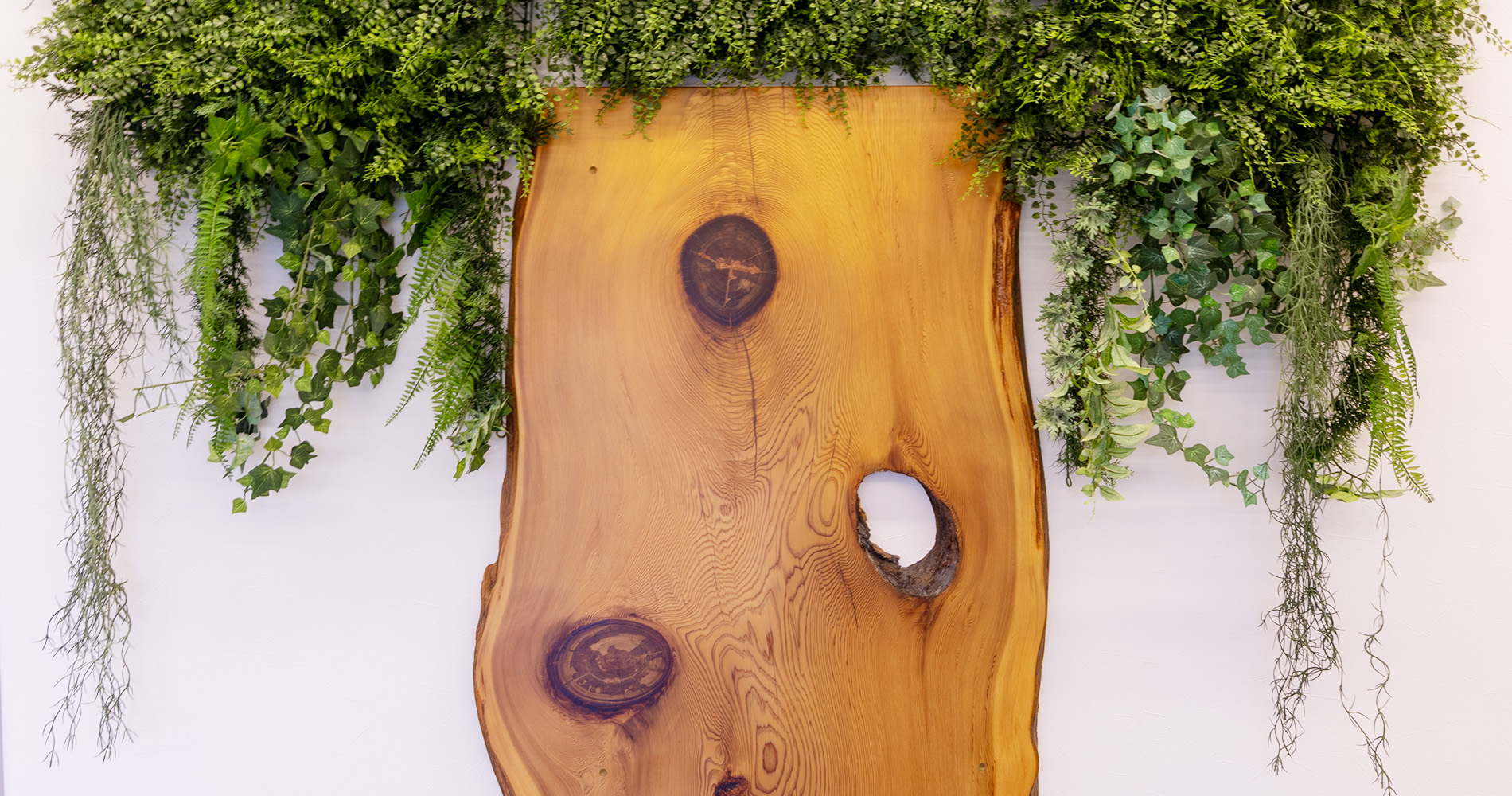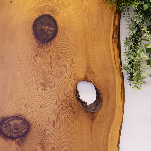 BASE.104(ベース.イチマルヨン)の店内に一歩足を踏み入れると、目に飛び込んでくるのは屋久杉の一枚板。
